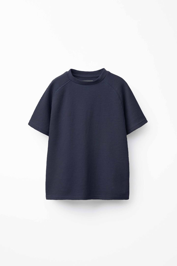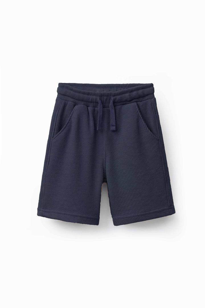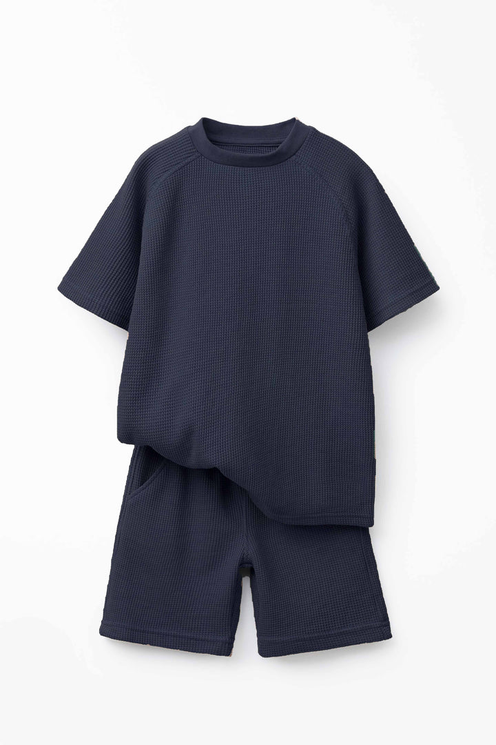 Crew neck waffle knit shirt with shorts. Draw-cord in round string.